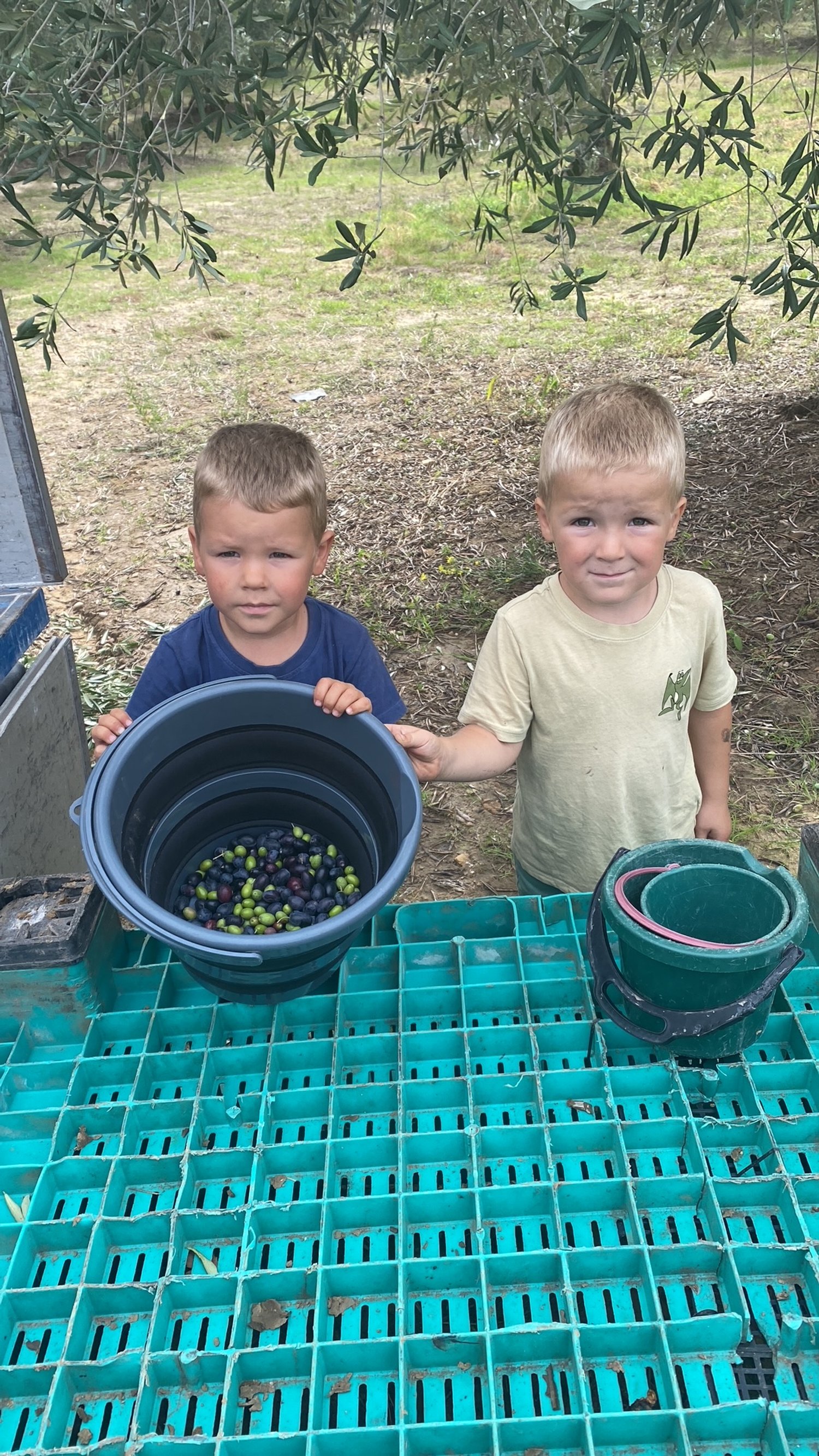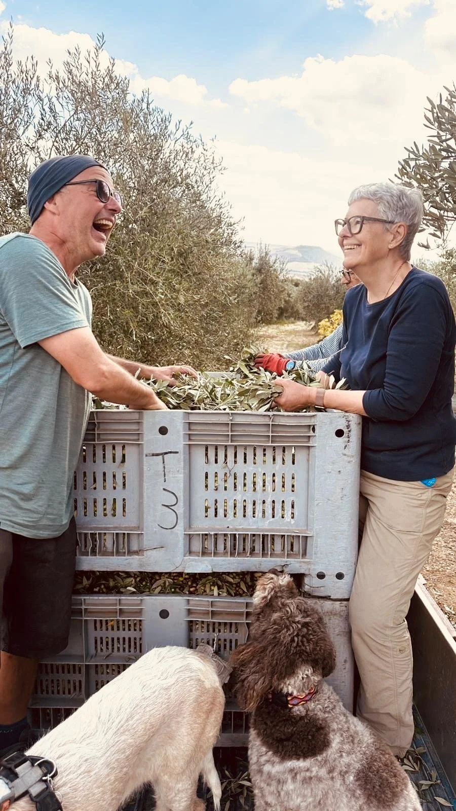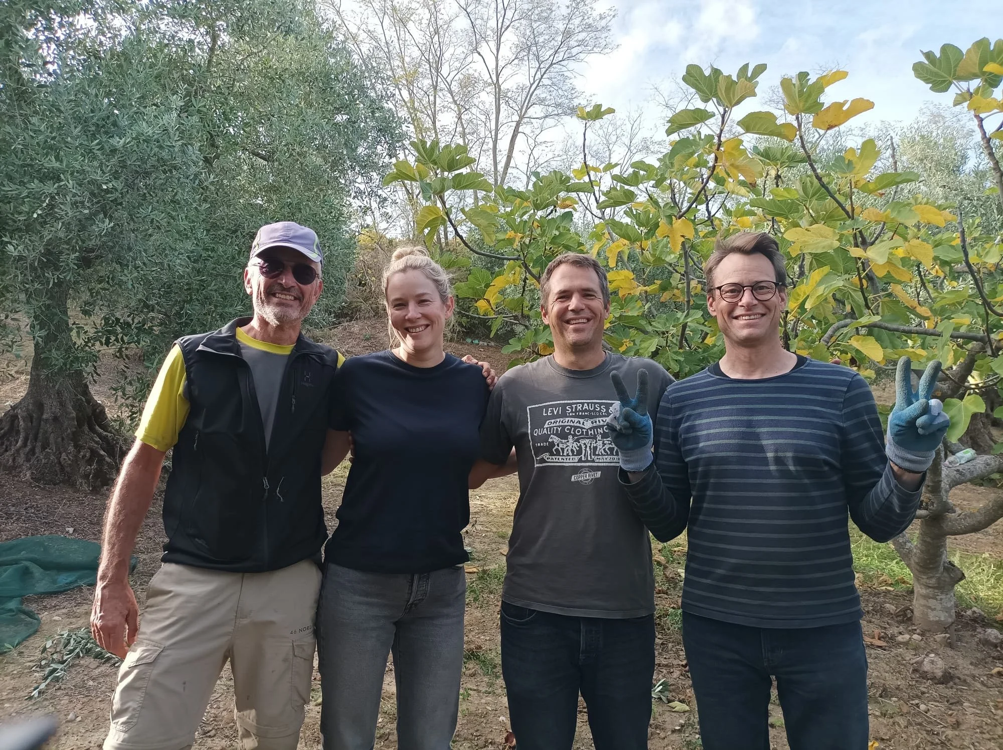 Bei Sonnenaufgang kamen wir im Olivenhain an. Nachdem wir die Netze ausgelegt hatten, arbeiteten wir in zügigem Tempo bis gegen 13:00 Uhr. Auf dem Hain gab es dann als Verpflegung Focaccia, Mozzarella und Käse aus der Basilikata und Apulien, begleitet von einem Glas Wein aus dem Weinberg unseres Chefs vor Ort, Giuseppe Mangione. Auch die Nachspeise mit typischen Süßigkeiten aus Irsina auf der Basis von Eiern, Feigen und Mandeln durfte nicht fehlen. Das gemeinsame Mittagessen bot auch Gelegenheit, sich zu unterhalten, zu lachen und Kommentare zur bereits geleisteten Arbeit auszutauschen. Nach der Mittagspause wurde die Ernte bis gegen 16 Uhr fortgesetzt, als in Süditalien die Sonne wegen der erfolgten Zeitumstellung unterzugehen begann. Die Anwesenheit von Cédric, Claudia und ihren 4-jährigen Zwillingen Jan und Leo brachte frischen Wind und jugendliche Fröhlichkeit in die Arbeitsgruppe. Wir hatten wirklich viel Spaß, trotz der sehr anstrengen Erntearbeiten.